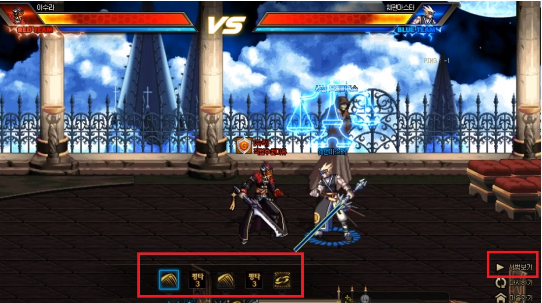 게임 시작을 누르셨으면, 다음처럼 화면이 바뀌게 됩니다. 스킬 그림창을 보여주는데, '시범보기'를 통해 콤보 하는 방법에 대해 배우시게 됩니다.