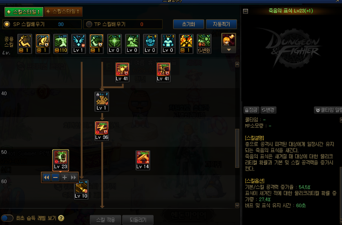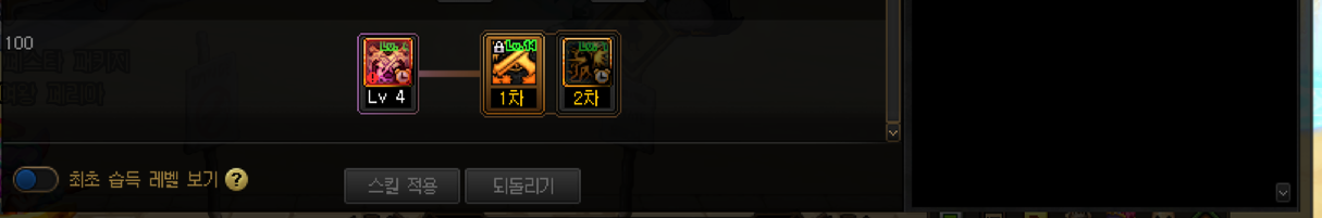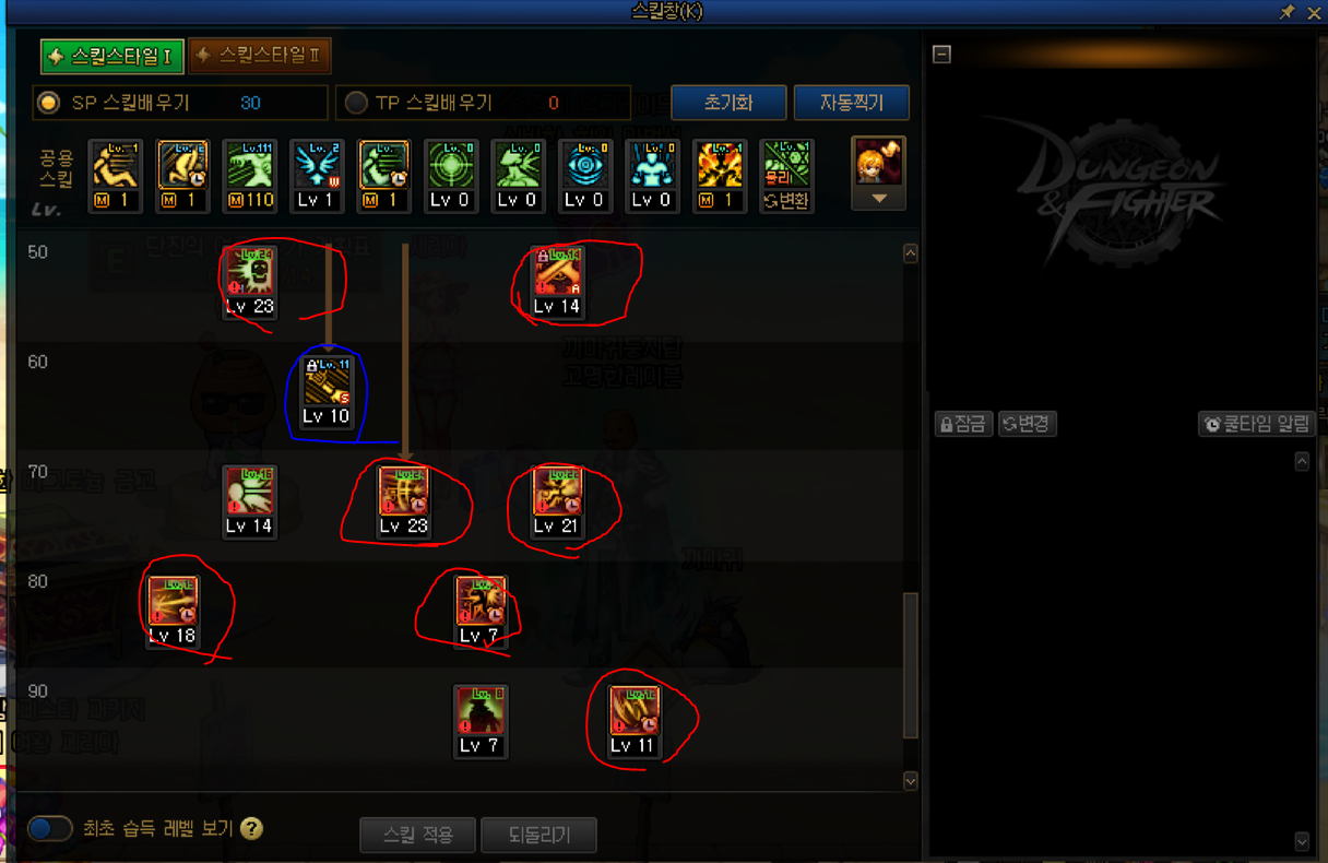 선택스킬 선택 구간 - 대부분 스킬포인트가 부족해서 선택부분중 일부를 택하는 모습입니다.
