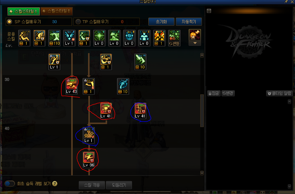 2. 남 레인저 스킬트리 - 빨간색은 필수 스킬, 파란색은 선택 스킬입니다. tp는 선택스킬 부분에 따라 달라집니다.