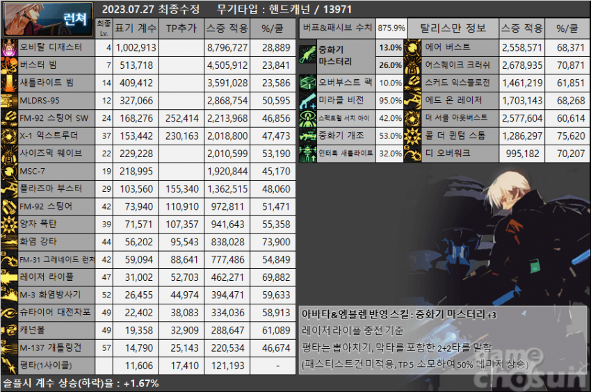 데미지 10% 상향까지 합치면 대략 11.5% 정도 상향 되었습니다.