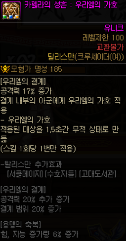 게이지를 채워야되는 딜러 입장에서 갑자기 탈리스만 낀 우리엘의 결계를 펼친다면...흠 센스가 없다고 보죠.