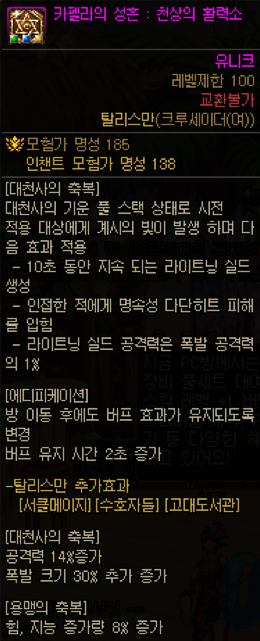 ▲ 대천사의 축복 탈리를 꼈을 경우, 라이트닝 실드이므로 굳이 터뜨릴 필요는 없습니다. (다단히트 스킬)