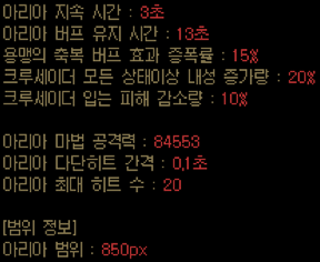 ※ 용맹의 아리아 장판 지속시간 : 3초 / 버프 유지 시간 : 13초