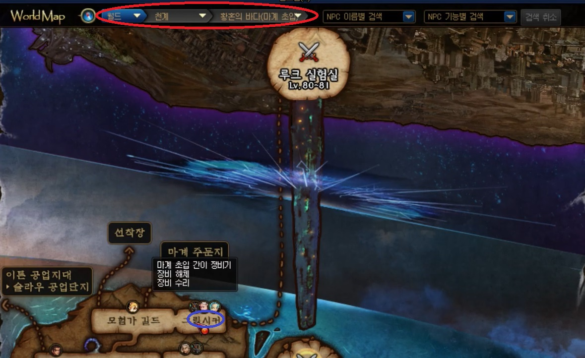 사진 밑의 '월드 - 천계 - 황혼의 바다'로 지정하시고, 노란색 부근을 마우스 왼쪽 버튼을 클릭해 이동합니다.