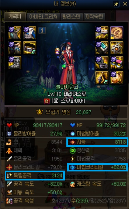 여기서 밝게 빛나는 것은 '지능', '마법크리티컬' '독립공격'입니다.