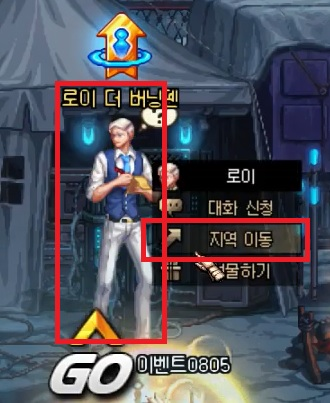 '로이 더 버닝펜'을 눌러 '지역 이동'을 누른 후에, 지역 이동이 되면 다시 '로이 더 버닝펜'을 '클릭'합니다.