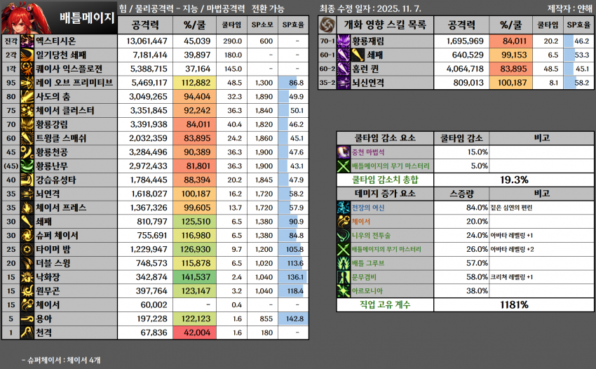 25년 6월 VP 패치 이후로는 트윙클 스매쉬, 사도의 춤이 많이 좋아져서 배메에게 부족한 한방 딜(트윙클 VP 2번)과 애물단지로 전락했던 사도의 춤을 쓸수 있는 스킬로 만들어 줬기 때문에, 기본적인 골자는 쇄퓨타라 불리는 기본기 3개, 1차각성 이후의 딜, 패시브 스킬을 모두 마스터 한 후, 상황에 따라 취사선택 하는 쪽으로 방향을 잡으시면 되겠습니다. 기존에는 나벨 고유 융합석 중 특수장비(보조장비, 마법석, 귀걸이) 중 35레벨 융합석의 경우 배틀메이지는 2개 스킬(뇌연격, 체이서 프레스)을 적용받기 때문에 35레벨 스킬을 집중적으로 강화하는 빌드가 대중적으로 쓰이고 있습니다. 그러나 25년 11월 5일 시행된 SP효율 패치 이후에는 35제 스킬 중 하나를 버리고 40제 강습유성타 + 패황유성권 VP 채용도 상당 수 보이고 있습니다.