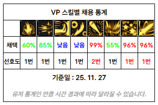 2025년 4월 1일 기준으로, 지금은 다소 낮은 각성기 계수와 직전 시즌 범위증가 아이템의 교체로 약간의 타점 문제가 있지만, 여전히 좋은 유틸, 때려넣기 좋은 스킬 구조 등으로 기본 체급이 매우 높은 딜러입니다. VP 이후로는 부족한 한방 딜을 보완해줄 스킬도 생겨서 앞으로 메타 변동이 크게 일어나지 않는 한 적당히 좋은 딜러, 템 체급만 갖추면 1인분 이상은 할 수 있는 딜러로 활약할 것입니다.
