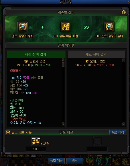이렇게 증폭이 묻은 장비를 게임 용어로 똥이 묻었다고 하는데, 이것을 계승시키면 자신이 착용하고자 하는 아이템에 증폭을 옮기실 수 있습니다.