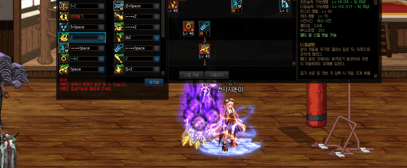→ 방향키를 누르면서 Z를 입력해 원인치펀치를 사용하면서 →키를 떼지않고 Z를 다시한번 누르면 라이트닝 댄스가 발동되어 상당히 매끄럽게 스킬이 이어짐