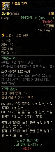 사를의 가면 ( 35~45/60~95 쿨감 50퍼 스킬공격력 35퍼 감소 출혈/중독 상태이상 부여)