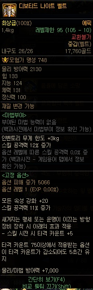 벨트 - 디보티드 나이트 벨트 ( 모속20, 스증11, 타격카운트버프 유지 )