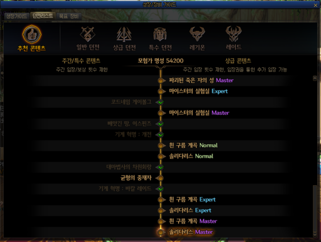[던전리스트] 탭에서는 명성에 따라 본인이 어떤 던전을 돌 수 있는지, 추천 컨텐츠는 무엇인지 알려줍니다.