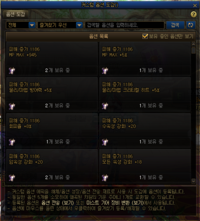 커스텀 옵션 도감이란, 가지고 있는 커스텀 장비의 옵션을 보관하는 곳입니다.