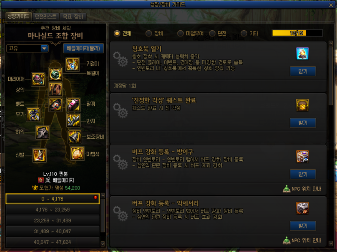 해당 기능의 [성장가이드] 탭에서는 명성별로 해야 할 간이 퀘스트, 추천 장비 세팅등이 있습니다.