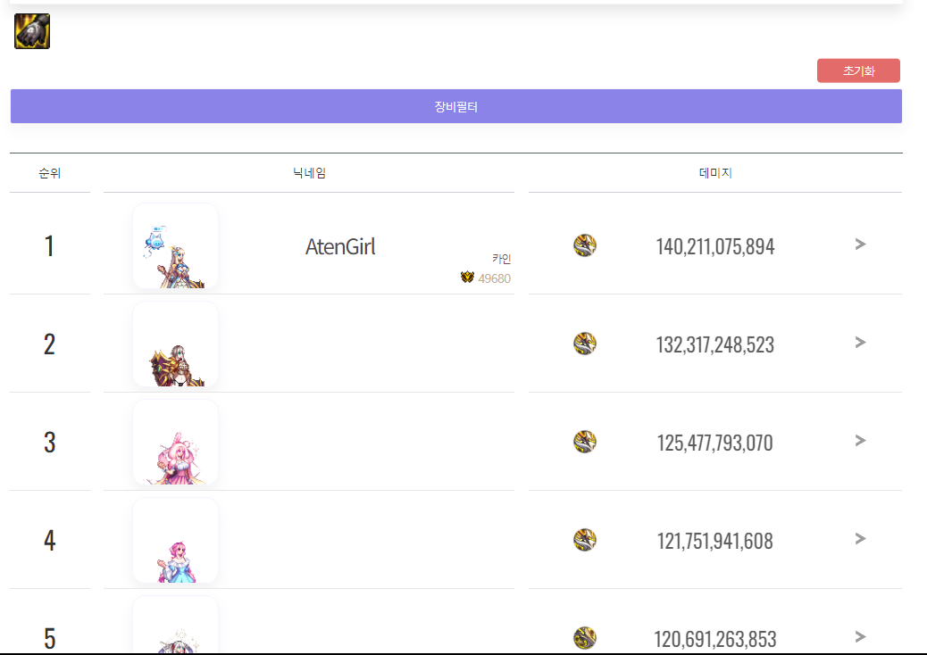이 중에서 상의/하의/반지는 커스텀장비가 고정되어 있고