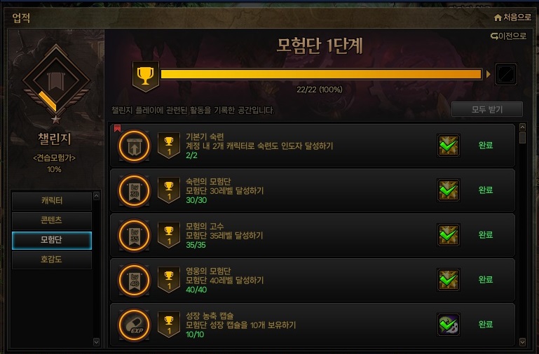 기본기 숙련 모험단 심볼을 획득하고 대표 챌린지로 설정을 했습니다.  지금 현재 본캐는 인도자 렙 15 되었는데 숙련도 경험치 많이 올릴 수 있어서 너무 좋아요
