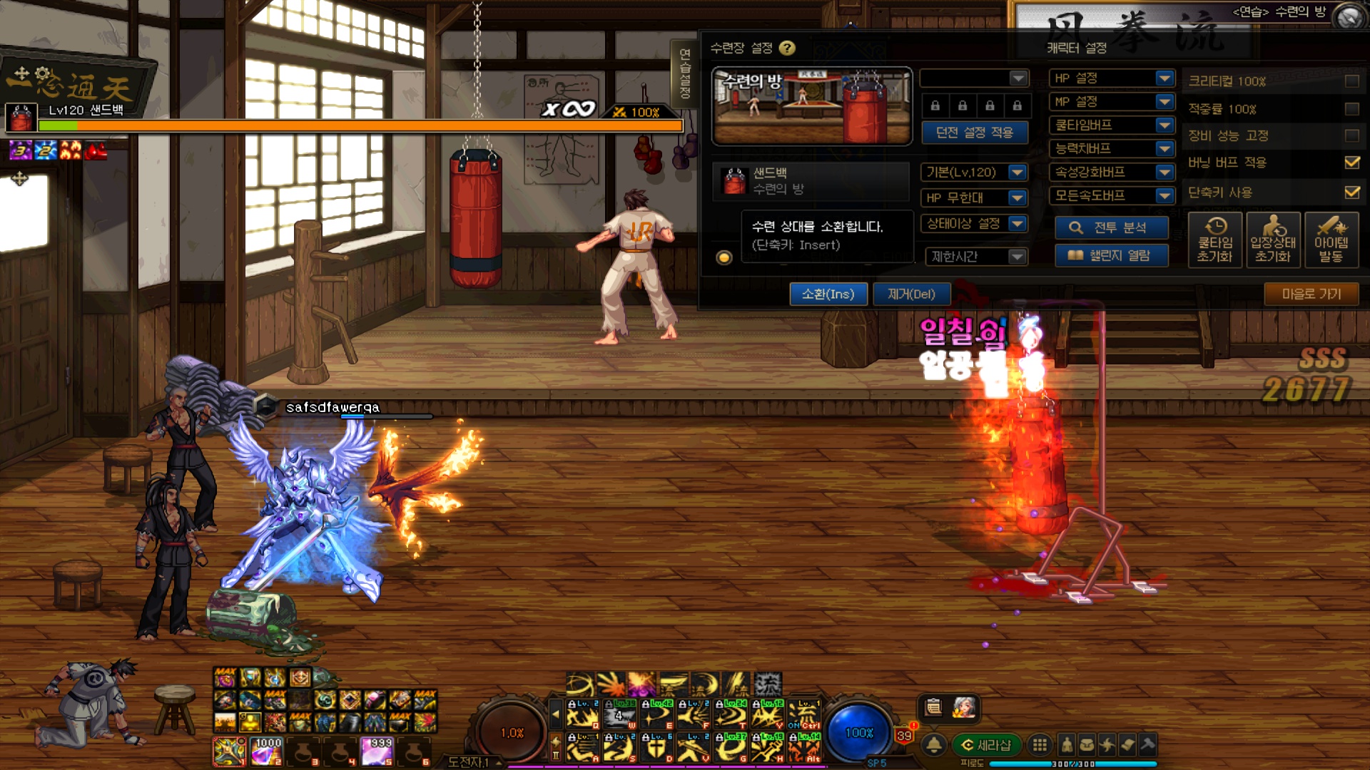 수련의 방 입장 후 방향키 움직이지 말고 샌드백 그자리에서 생성 -> 맹룡 >>쪽 한번 <<쪽 한번 돌진 (총 2회 돌진)