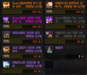 hp,mp회복 포션, 데미지 증가 물약, 장비 수리쿠폰, 종말의 계시 등등 일상적으로 소모되는 템들을 지원해주며