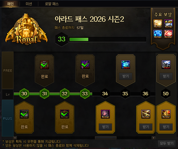 패스 레벨을 올리면 여러 보상을 주며 (매주 최대레벨 제한 있음, 모든 유저가 같은 레벨까지만 올릴 수 있습니다, 이 사진 넣는 시점 기준 모든 유저가 33렙 전후로만 가능)