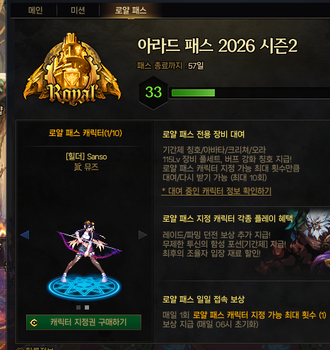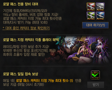 전용장비 대여는 템 없는 부캐라던가, 버프강화가 없는 캐릭에 주시면 좋습니다(로얄패스 추가 지정권 구매시 늘어나요)