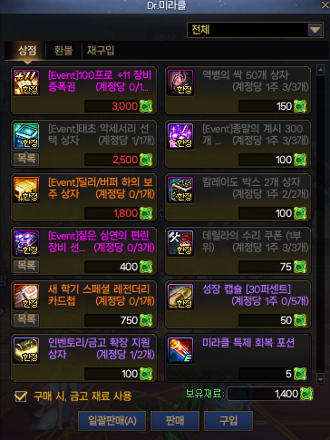 3순위:11증폭권,태초악세사리, 딜러/버퍼 하의 보주 상자 (3순위 템이 제일 가치가 높지만 주간품목을 사더라도 재료가 많이 남아서 결국에는 4순위까지 모두 구매 가능합니다