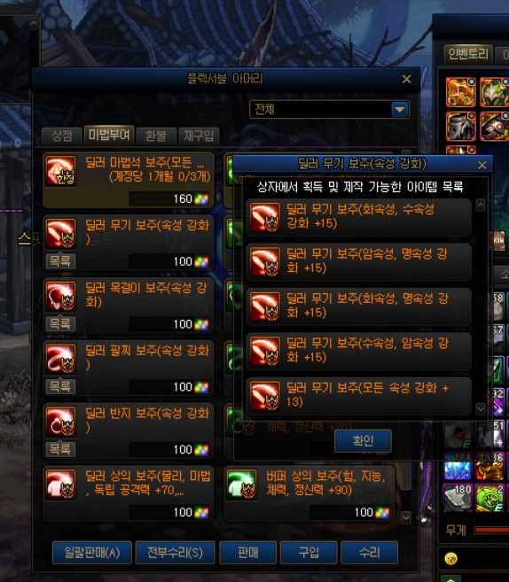 - 마법 부여비(이스핀즈 채널에 플렉서블 아머리에서 사방의 분열된 기운 100개로 속강15 보구 구매 가능)