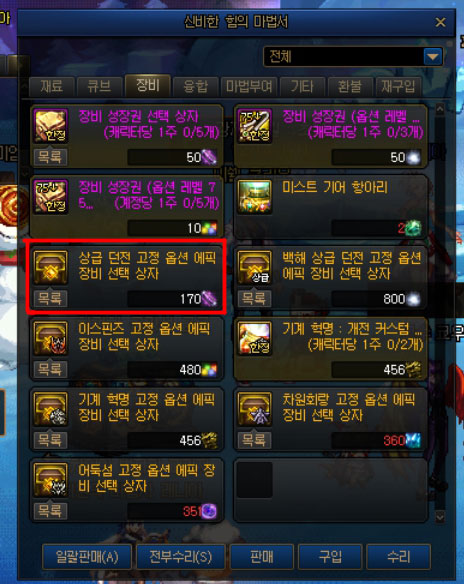 먼저 세리아방의 신비한 힘의 마법서에서 '상급 던전 고정 옵션 에픽 장비 선택 상자'를 구매합니다.