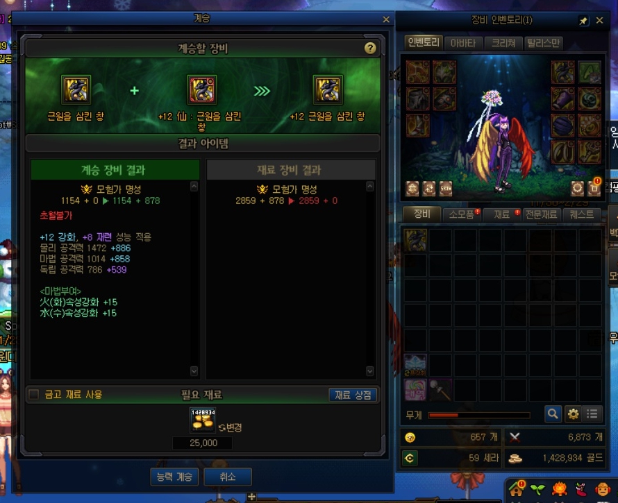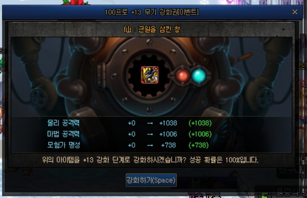 성공하면 신비한 힘의 마법서에서 다시 계승을 통해 본 무기에 강화 및 마법부여를 옮겨주고 다른 캐릭터에 +13 강화권을 사용하면 됩니다.
