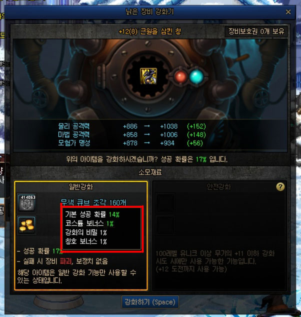 기본 성공 확률 14%지만 코스튬 보너스, 강화의 비밀, 칭호 보너스까지 해서 3% 확률이 올라간 모습.
