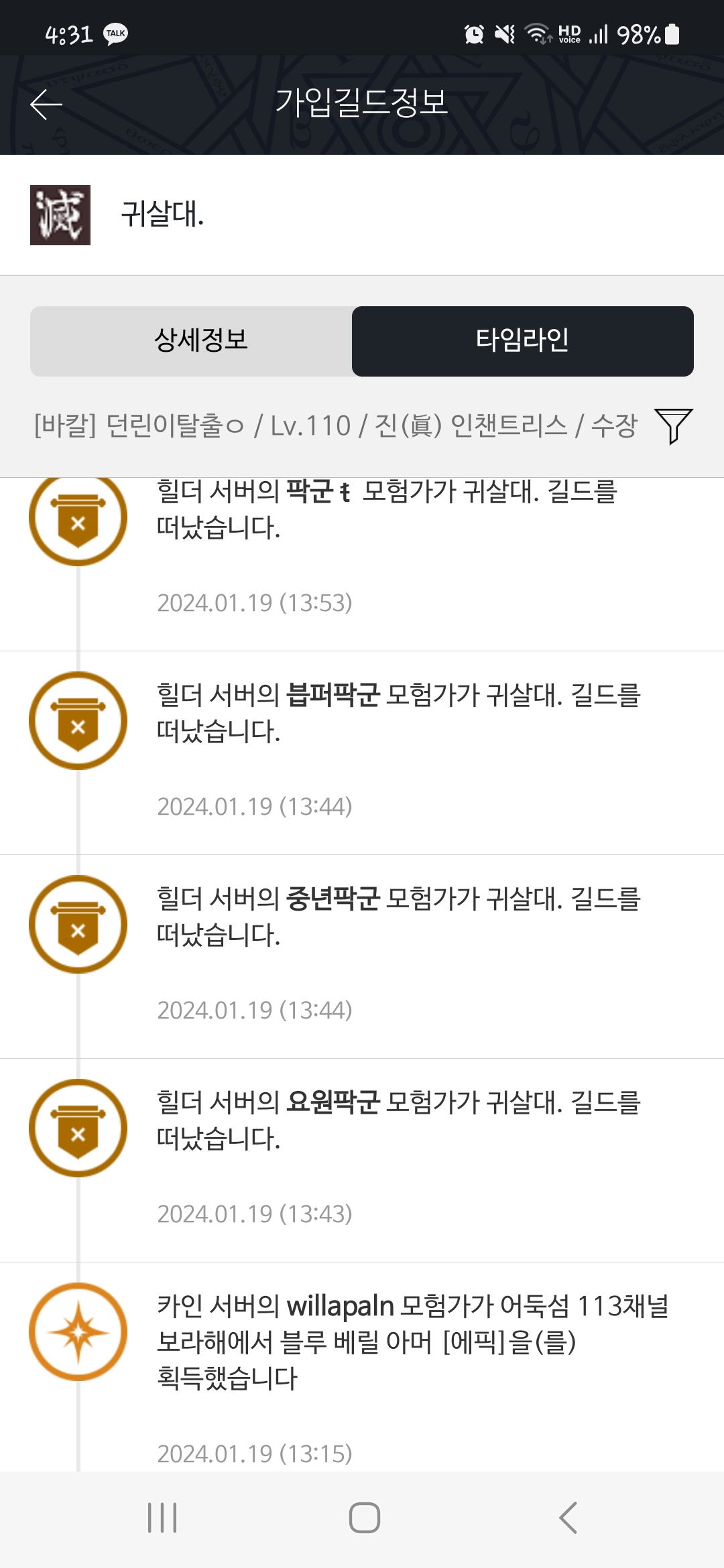 그리고 귀살대. 길드원분들 캐릭들 다 강퇴되셔서 놀라셨을텐데 죄송합니다
