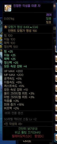 ex) 두 번째 각성에 도달한 자(깡스탯 낮음, 피해증가 +15%, 데미지 증가 +15%), 진정한 각성을 이룬자(깡스탯 높음, 피해증가+18%)