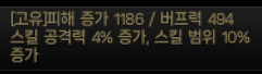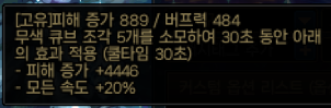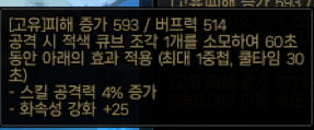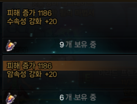 [2] 속성 강화 (최대 2종류), 5회 공격시 피해증가 +1292 방어력 -500 최대 (10중첩)