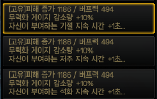 [3] 화상,출혈,감전,중독 지속시간 -10% 화상,출혈,감전,중독 상태 적 공격시 30초 동안 피해증가, 그 외의 상태이상 무력화 감소시 피해증가 (최대 1개 유효)