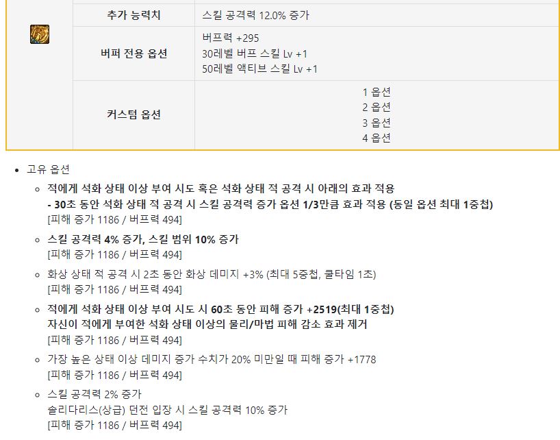 - 30초 동안 석화 상태 적 공격 시 스킬 공격력 증가 옵션 1/3만큼 효과 적용 (동일 옵션 최대 1중첩)