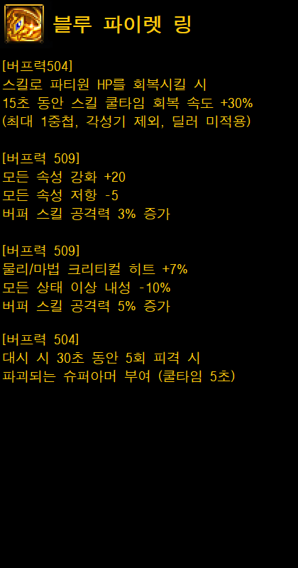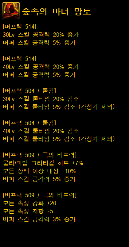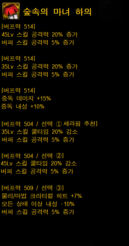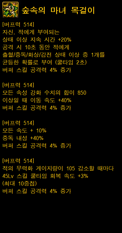 숲마팔에 504 버프력과 버퍼 스증이 있다만 여럿 유틸이 많은 딥다팔이 더 좋습니다. | 엔정목에도 514 4줄이 있다만 모든 내성 깎이는게 크기도 하고 숲마목에 비하면 메리트가 적습니다. | 마지막 504는 아무거나 해도 좋긴하다만 이왕이면 대시 슈아 504가 나아보였습니다. |