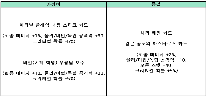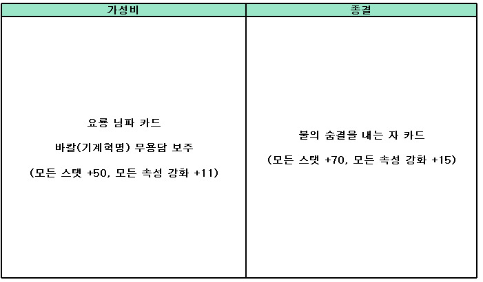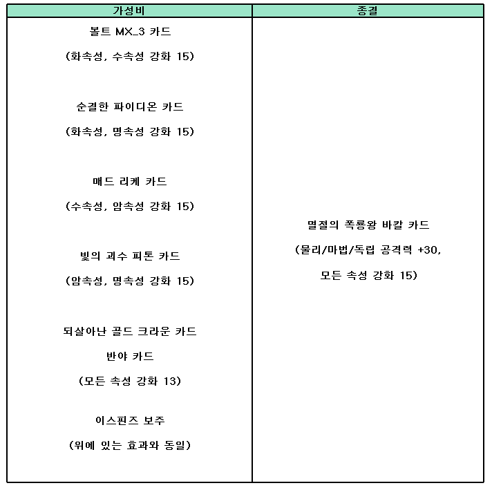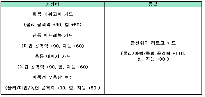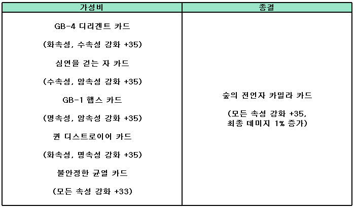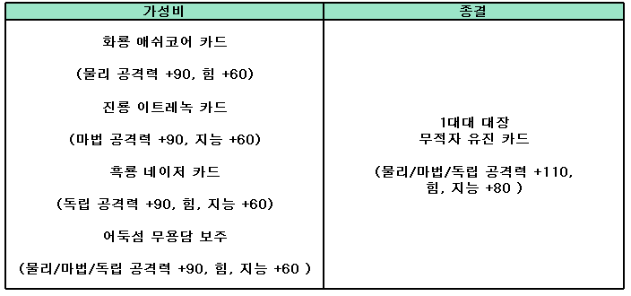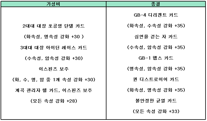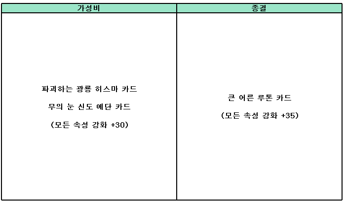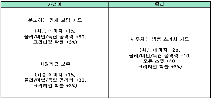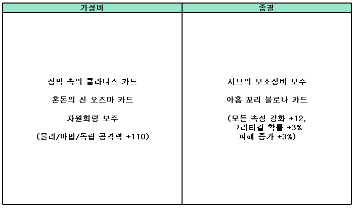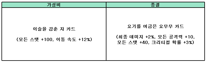 가성비 단계에서는 자신의 속성에 맞게 카드를 골라서 사용하시면 되고, 애매하다면 모든속성강화 13 카드를 사용하시면 됩니다.