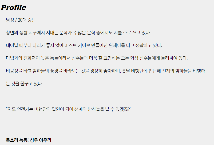 선계에서 전문직업 상점을 담당하는 NPC인 마일란 릿을 연기하신 성우 이우리님께서 3월 14일에 갑작스럽게 돌아가셨습니다.