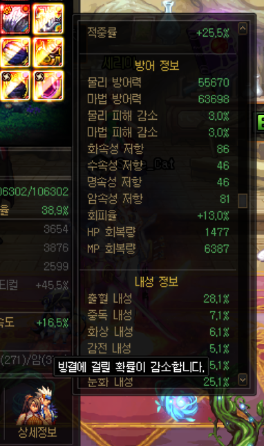 위 사진을 보면 증뎀 5퍼 + 내성1퍼 짜리각 3줄이 있고 모든 속성이 있죠?