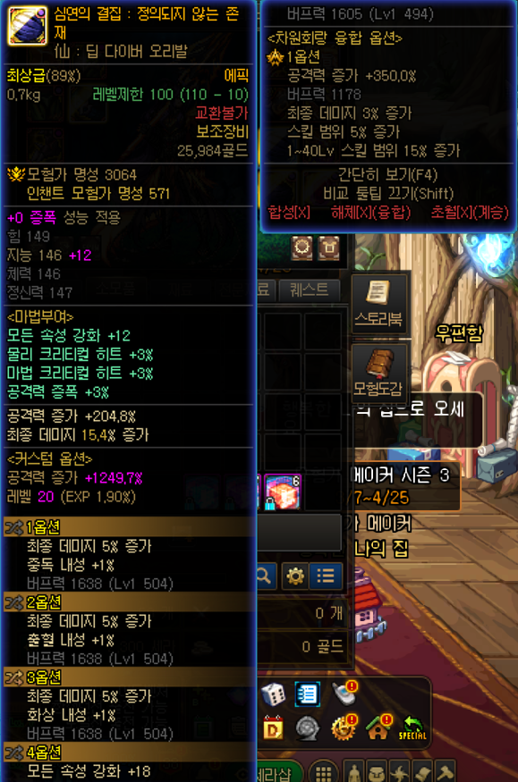 안내 해주는 대로 진행하셨다면 증뎀 5퍼 2줄 + 증뎀 8퍼 + 모속 인 마법석을 얻을 수 있습니다!