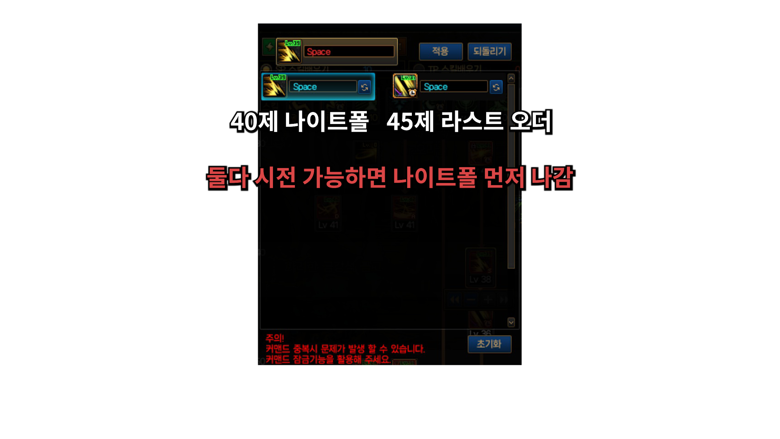<40제 나이트폴과 45제 라스트오더를 같은 커맨드로 두고 시전한 모습>