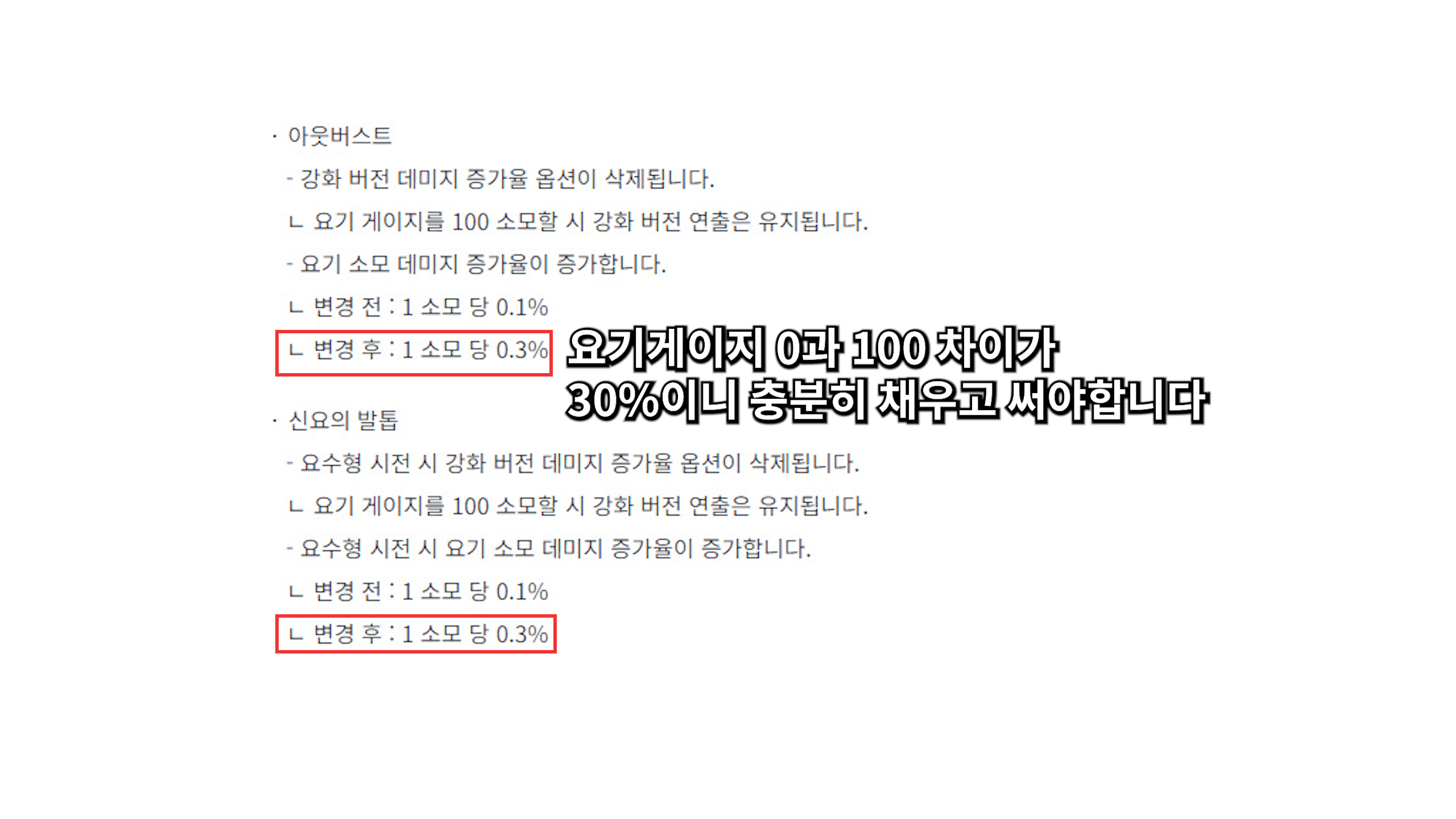 3월 21일 패치로 2차 각성기 아웃버스트와 95제 신요의발톱의 요수형 스킬의