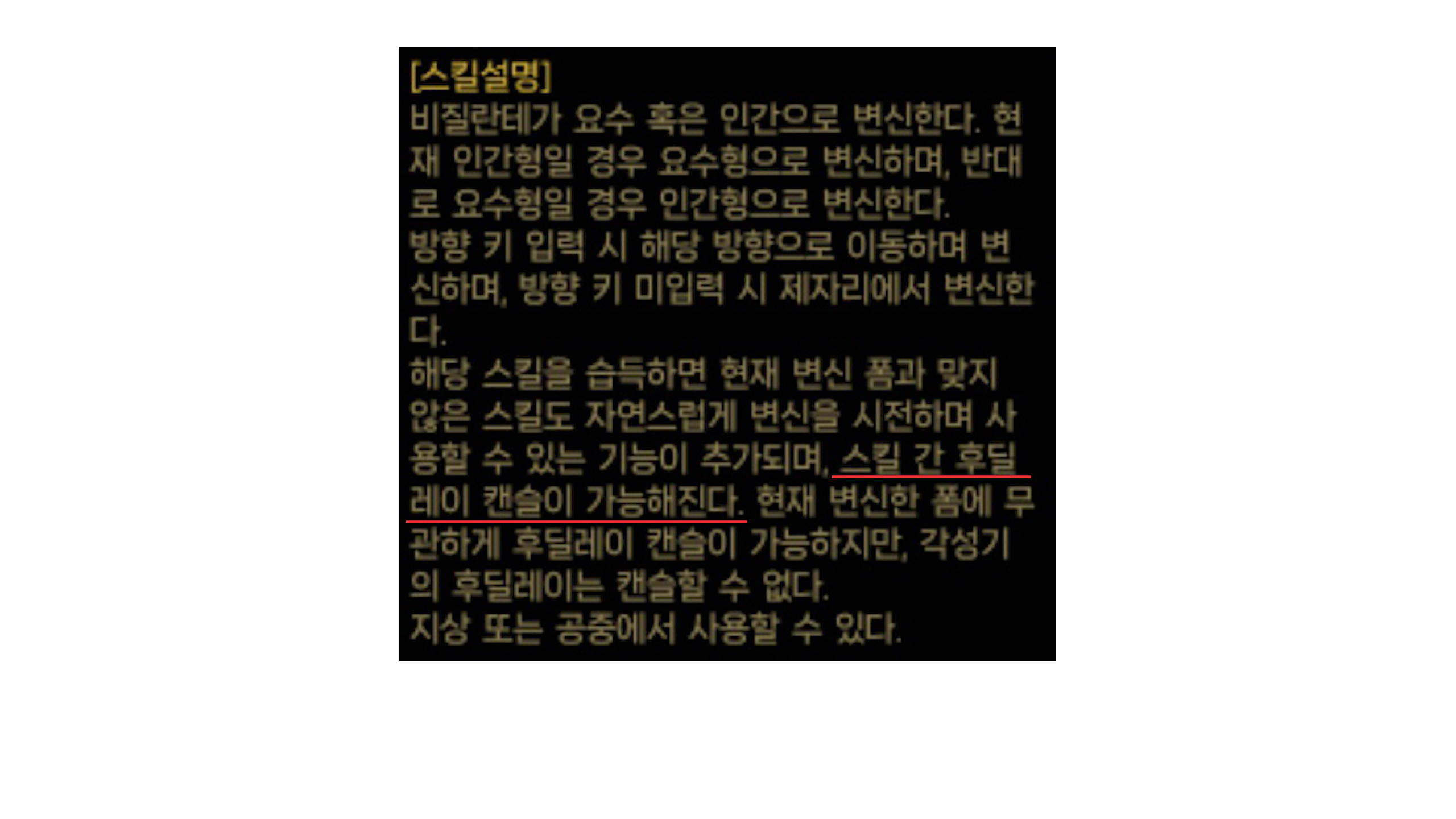 3월 21일 이전에는 인간형 스킬과 요수형 스킬을 번갈아가며 사용해야 후딜레이 캔슬이 가능했지만