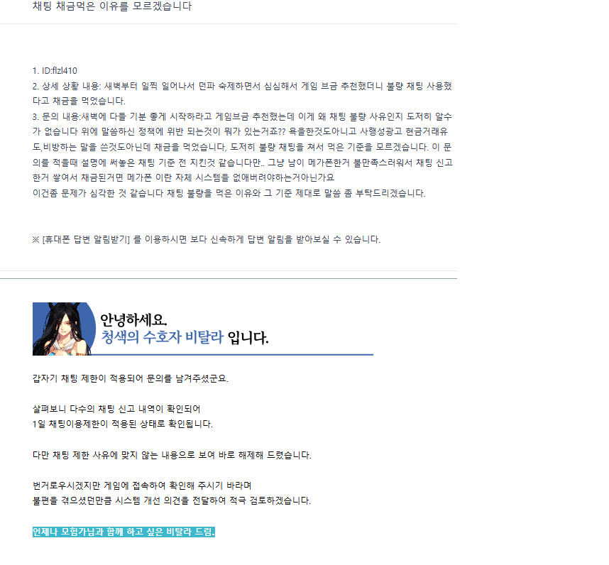 [공통] 오늘 새벽에 1일 채팅금지 문의 답변 왔습니다. 소름돋네요... (5)