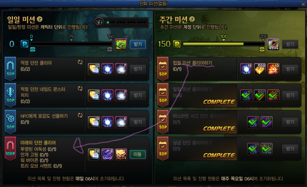 매주 목요일 06시 초기화에 초기화가 되지만 오픈은 토요일에 합니다. 주간 보상 1회