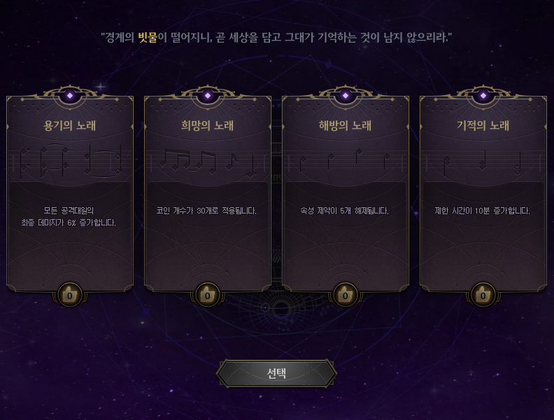 대부분은 사기 충전을 선호하시는 편이 많은데, 저희는 타오르는 투지(액티브 데미지 20% 증가) + 5분 시간 추가를 골랐습니다.