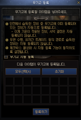 체크해두면 무기고에 이미 등록된, 중복인 템이 나오면 자동적으로 무기고에 등록되도록 설정 가능합니다