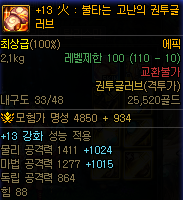 장비 이름 앞에 강화수치만큼 숫자가 붙으며 파란색 텍스트로 증가하는 능력치를 확인 가능합니다.