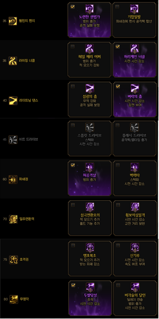 붕권 M + 호격권 M + 일주연환격 개화 및 강화를 채용한 트리이고, 제가 나벨 융합석 졸업 전까지 사용했던 스킬트리이기도 합니다.