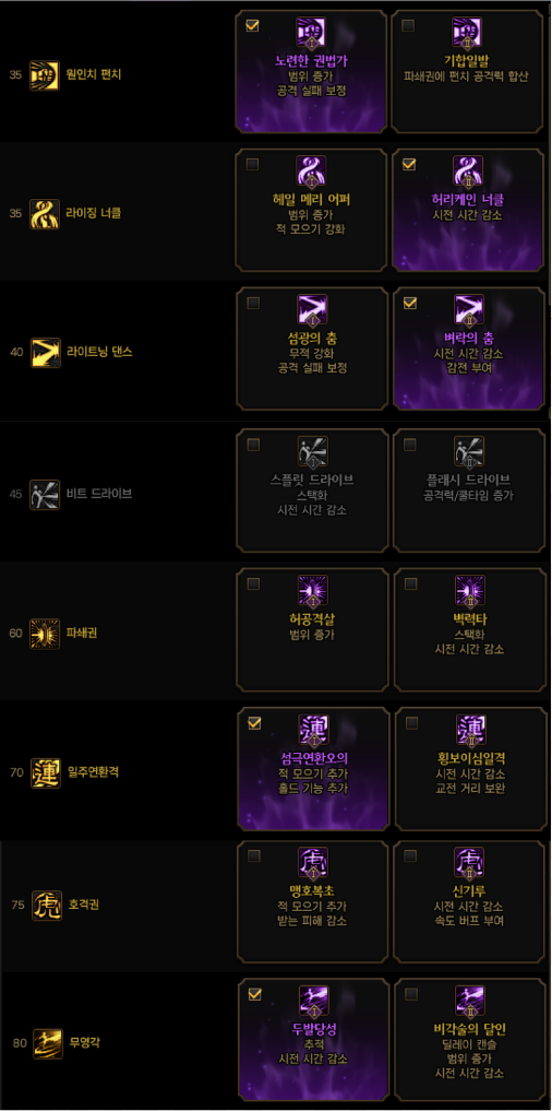 35레벨 스킬인 원인치펀치와 라이징너클을 몰빵하고, 75렙제인 호격권을 최소한으로 주는 스킬트리입니다.